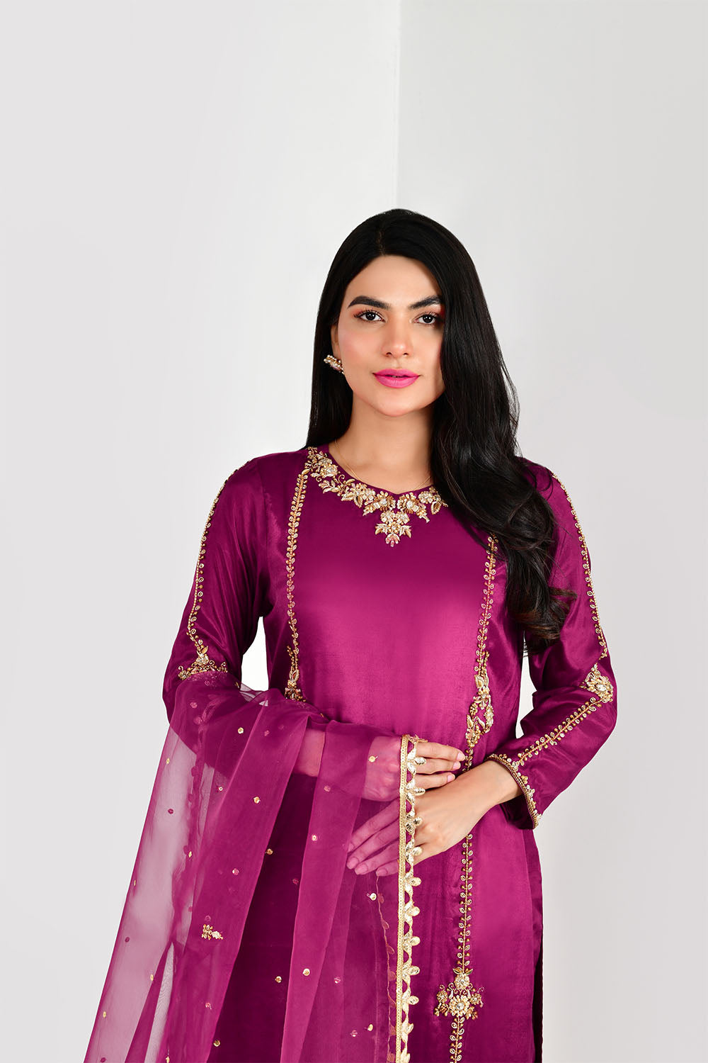 A exquisite affair of purple and golden, A gorgeous Cotton silk shirt adorned with embellishments of Naqshi, cutdana, sequins and crystals.