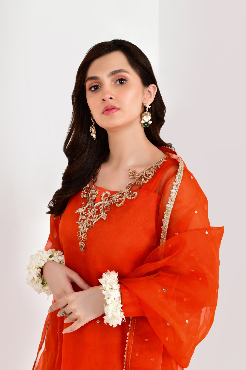 Graciously Crafted neon orange ensemble engraved with intricate hand embellished details and delicate cut work neckline with a dupatta with exquisite lace work on borders and sequins spray on it.