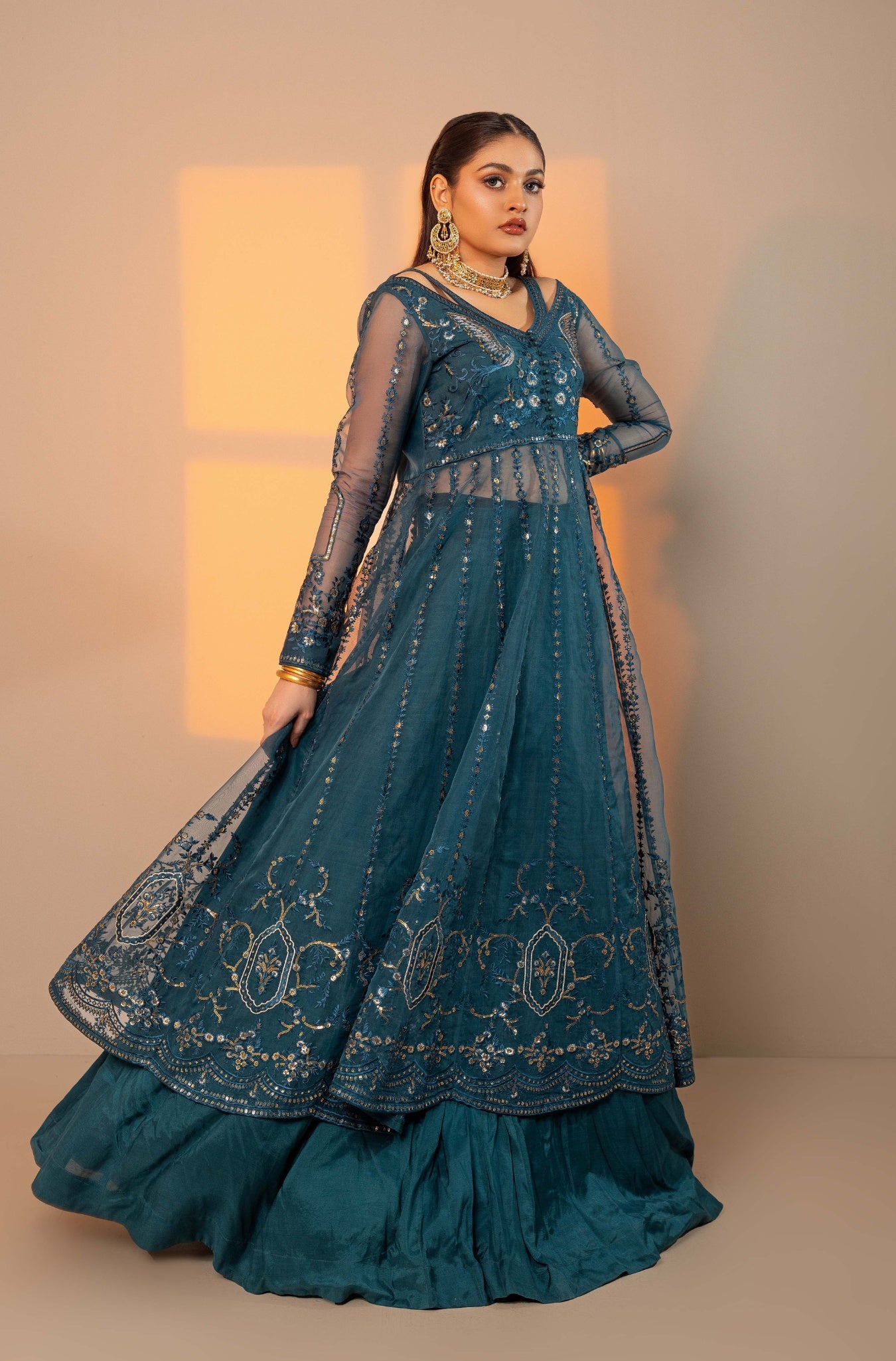 An ethereal masterpiece designed to capture hearts and turn heads. An elegant yet sophisticated shade of Teal Blue silhouette, crafted with intricate embroidery. The Sublime Pishwas is complemented with a cotton silk plain lehenga and a beautiful embroidered organza dupatta with a scalloped border. Creating a perfect balance of opulence and sophistication. This outfit is a must-pick for this festive wedding season!