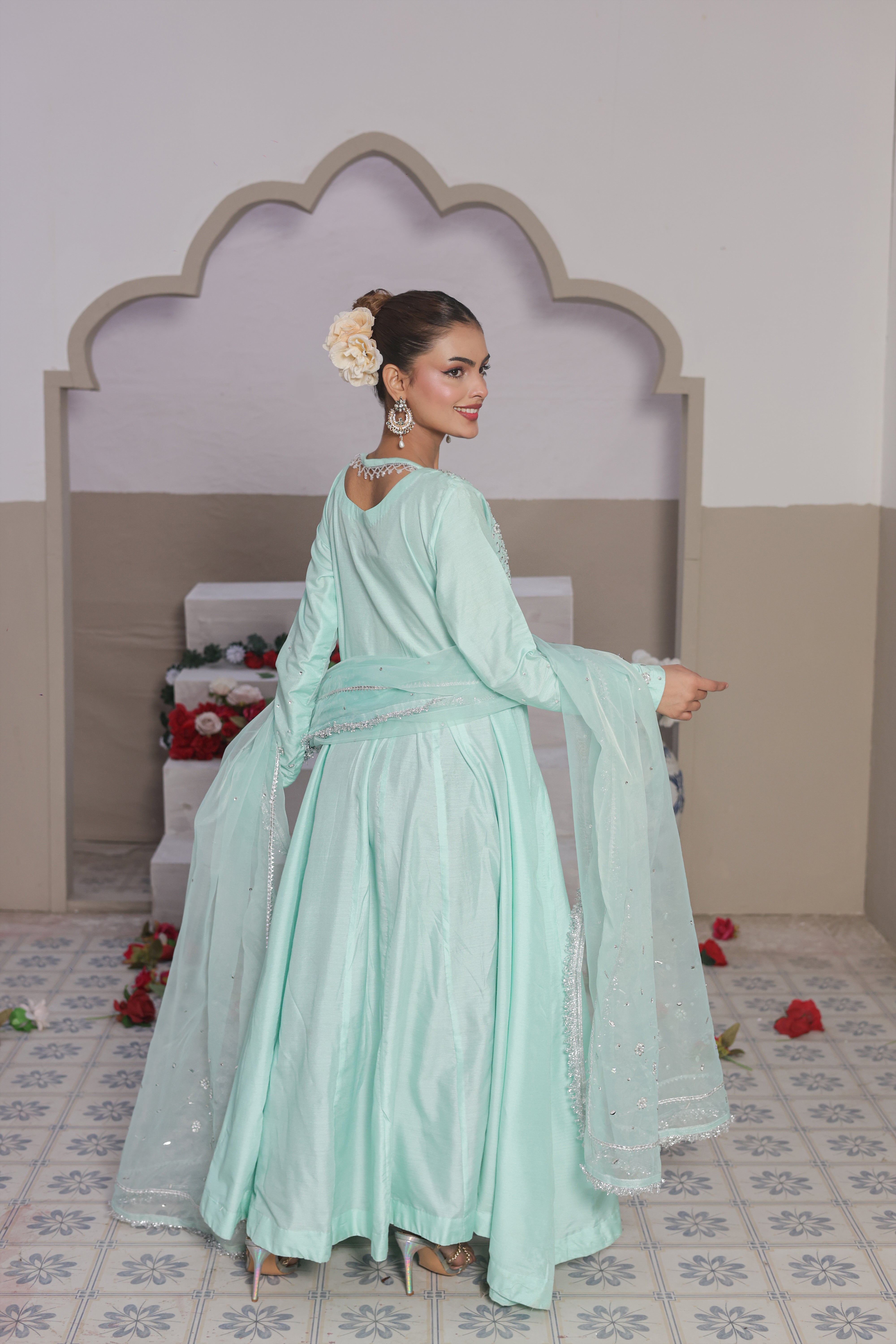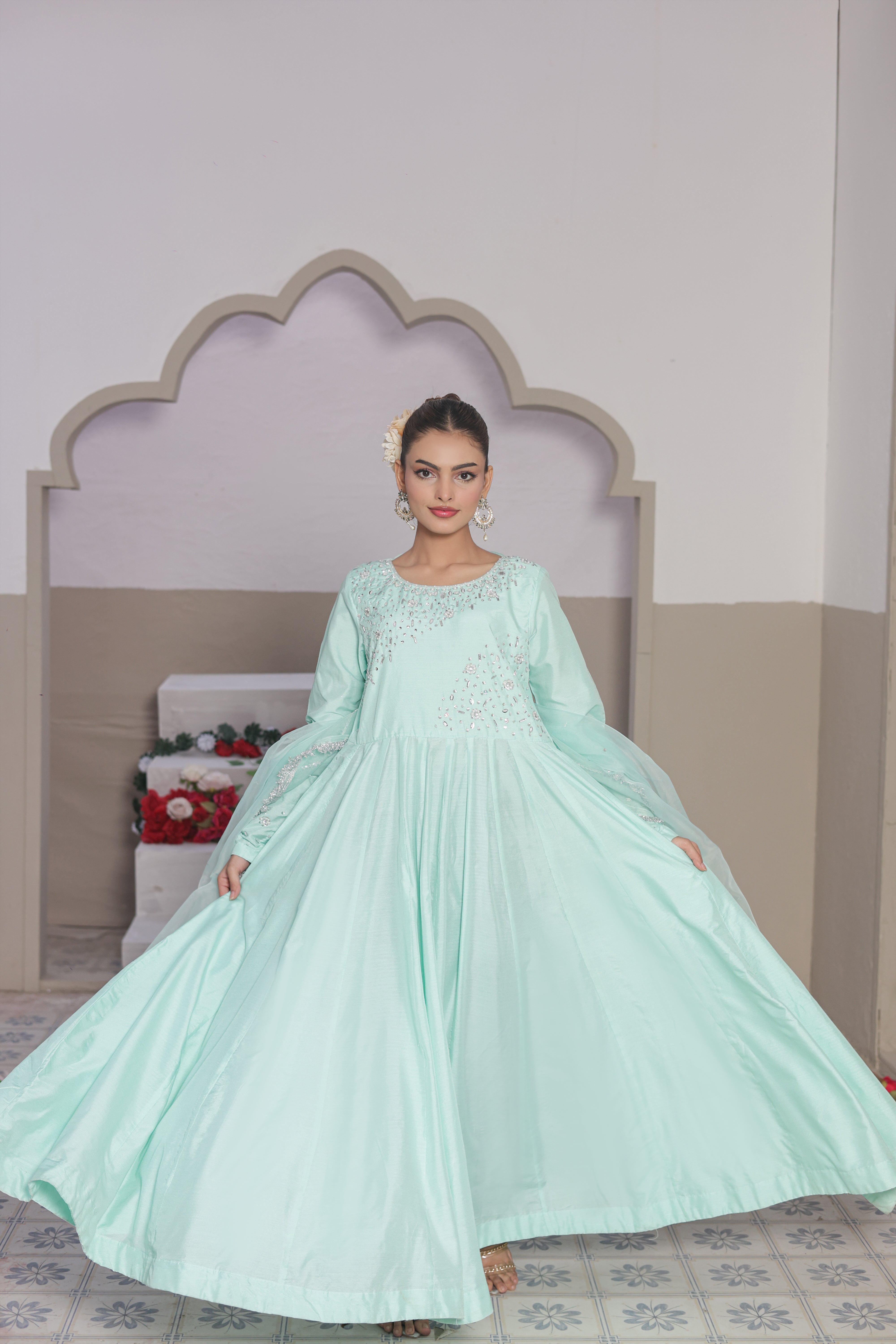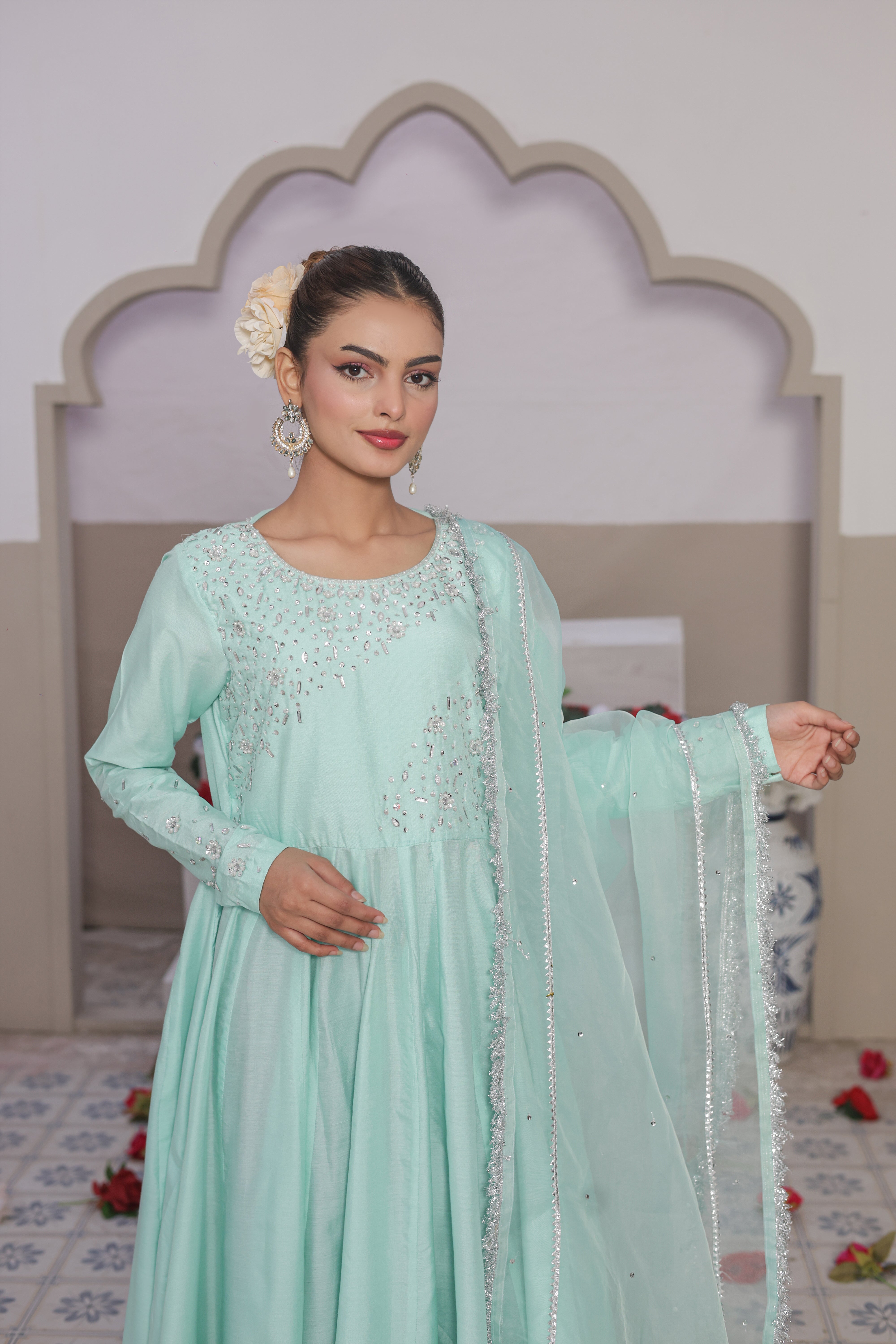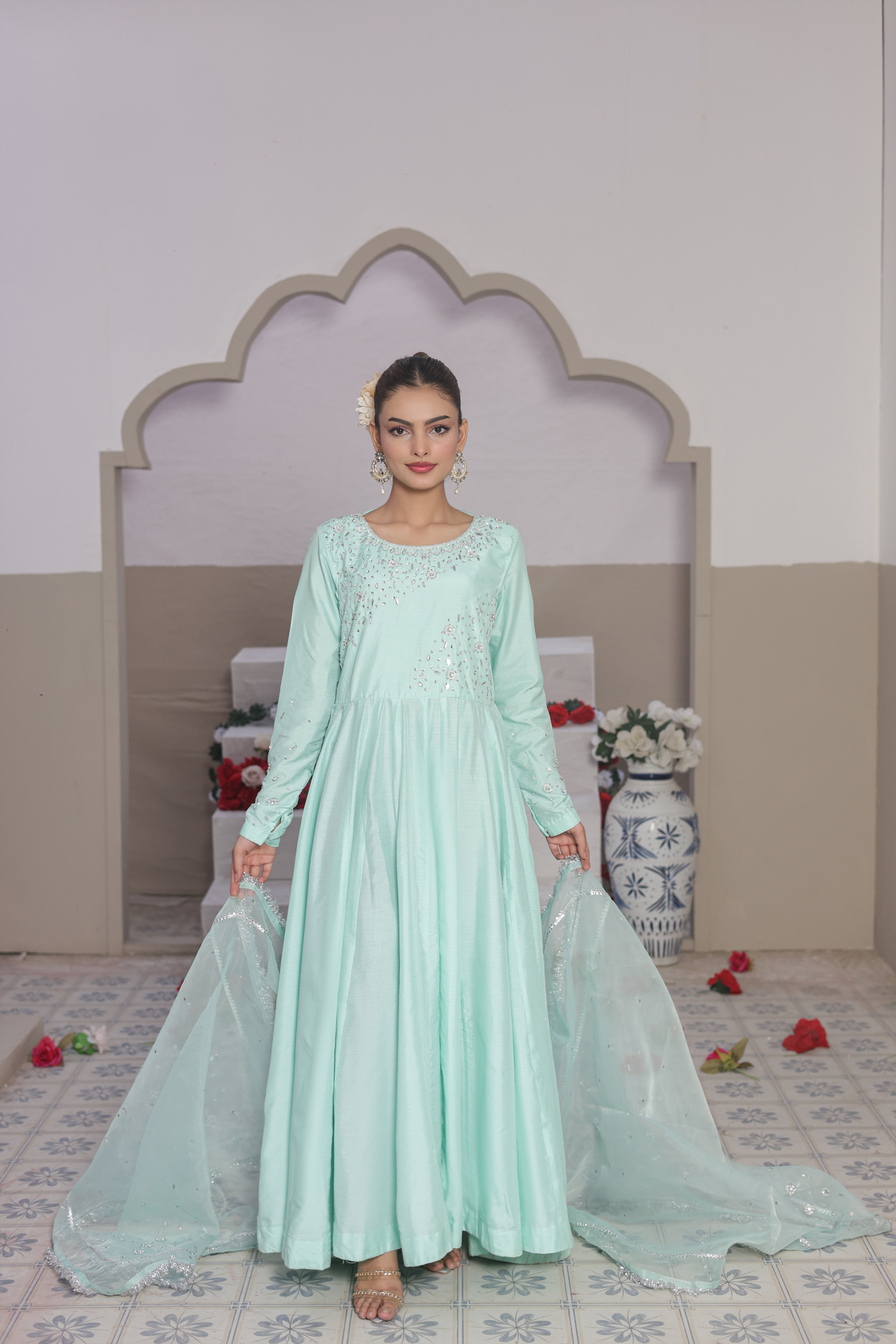 Elia is the classic pishwas reimagined in a soulful symphony of crystal, sequins, and pearls on premium cotton silk. This ensemble comes with the premium cotton silk and a hand embellished dupatta with lace work detailings to culminating in a statuesque silhouette that is guaranteed to turn heads. Made for moments that don't need noise.