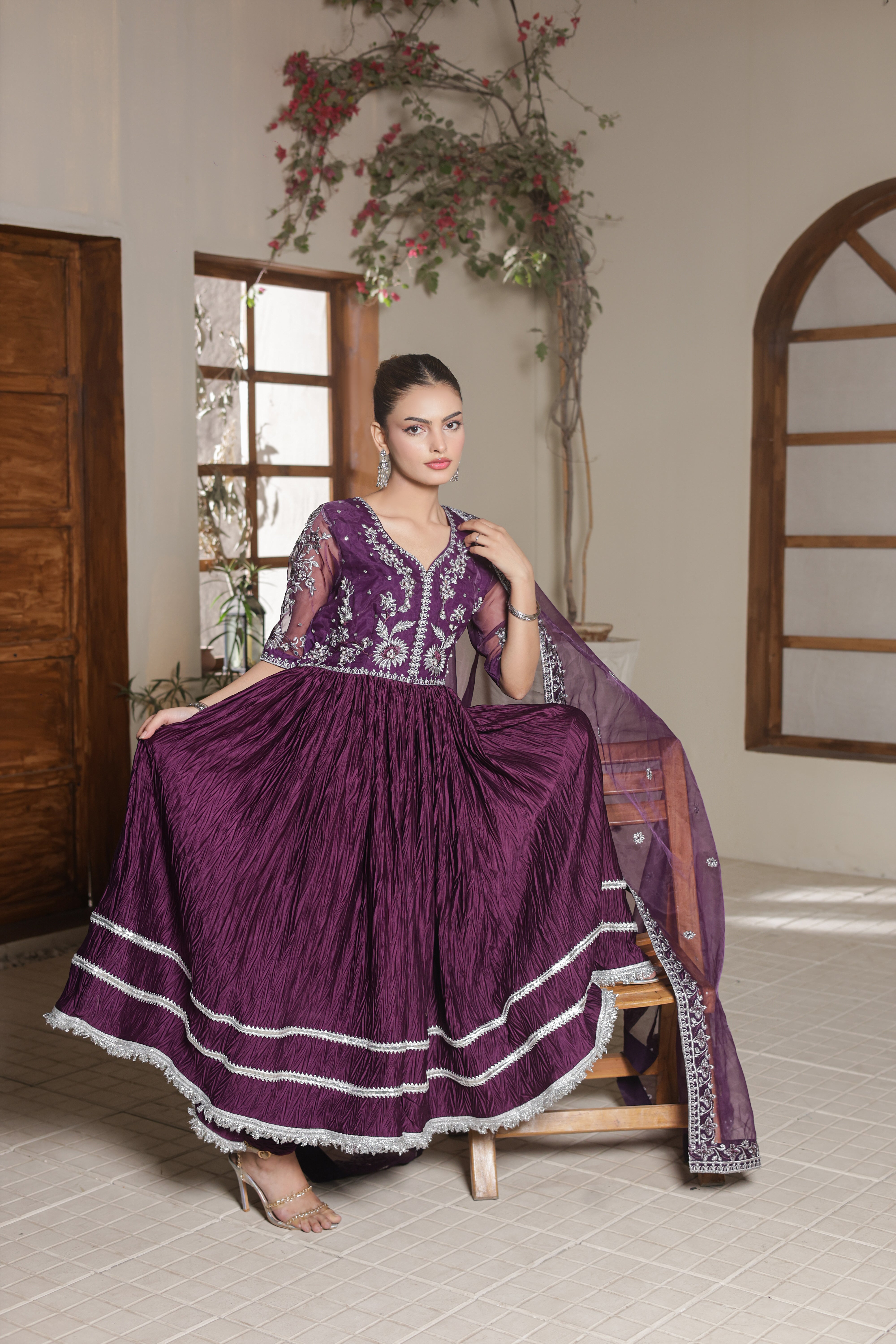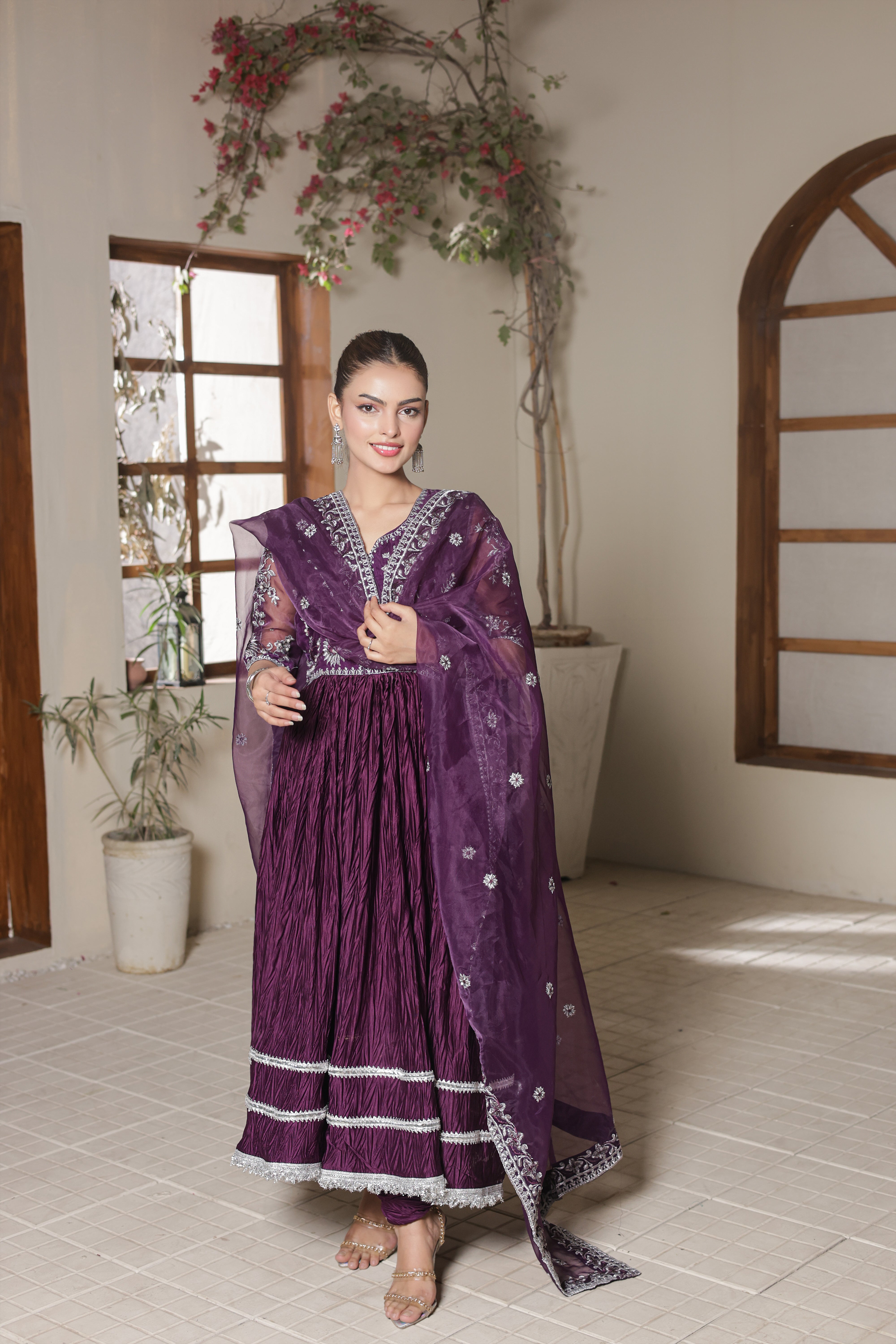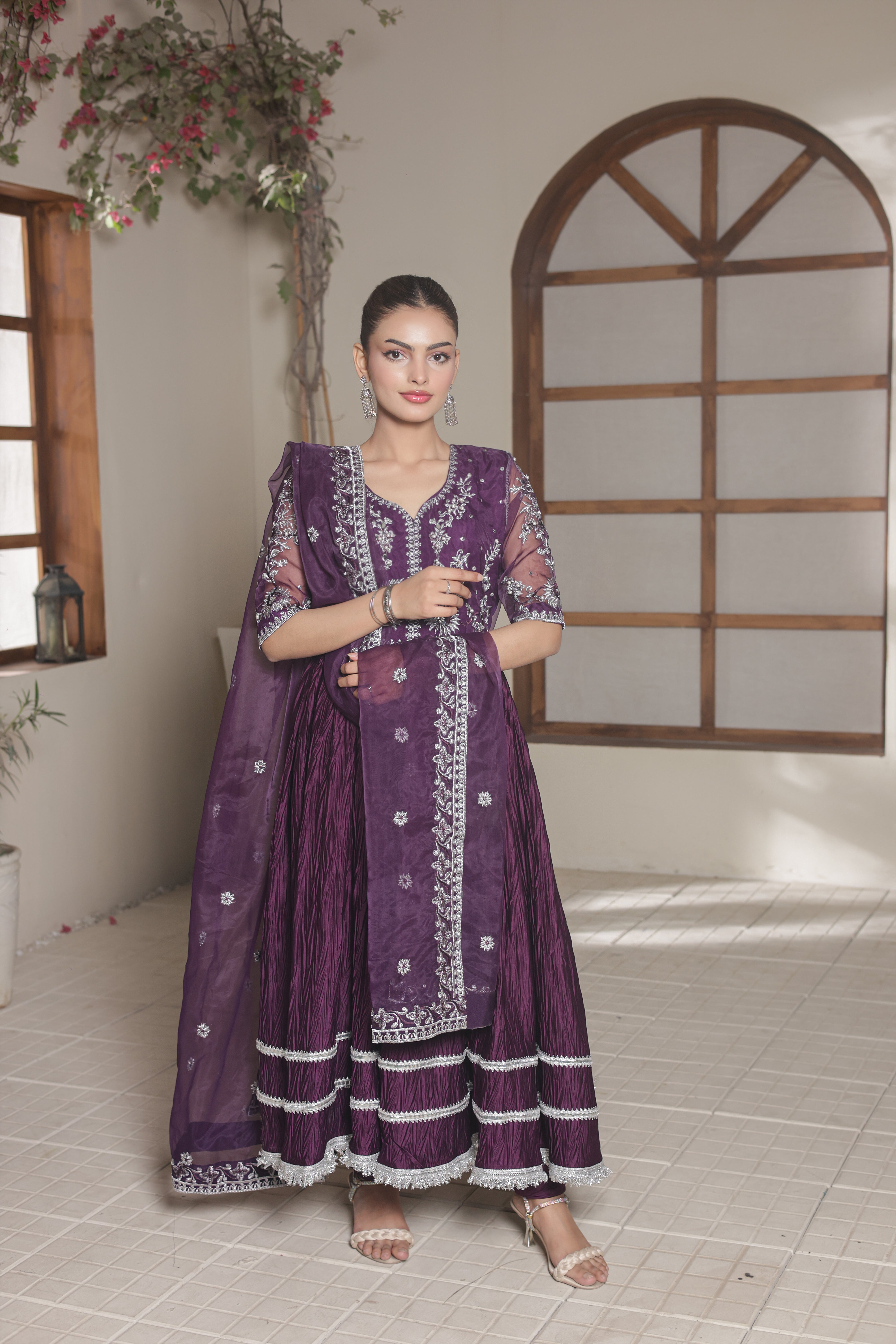 Evoking vintage glamour, Lina reimagines the classic pishwas in purple hue. Crafted from organza and silk crush, the pishwas is rendered with intricate embroidery with hand touching embellishment. Paired with a embroidered organza dupatta and silk churidar, this piece, with its perfect draping, is a true symphony of style.