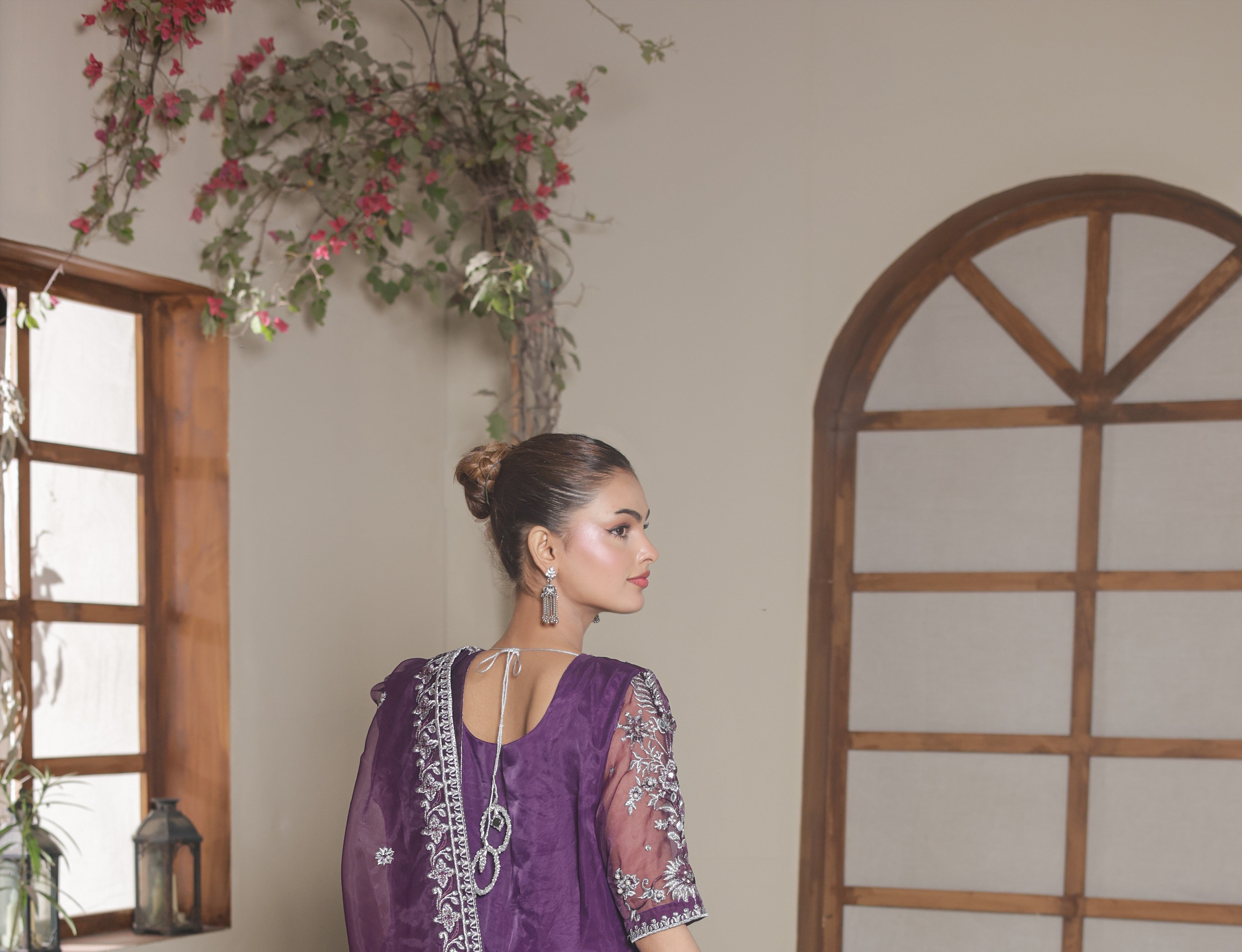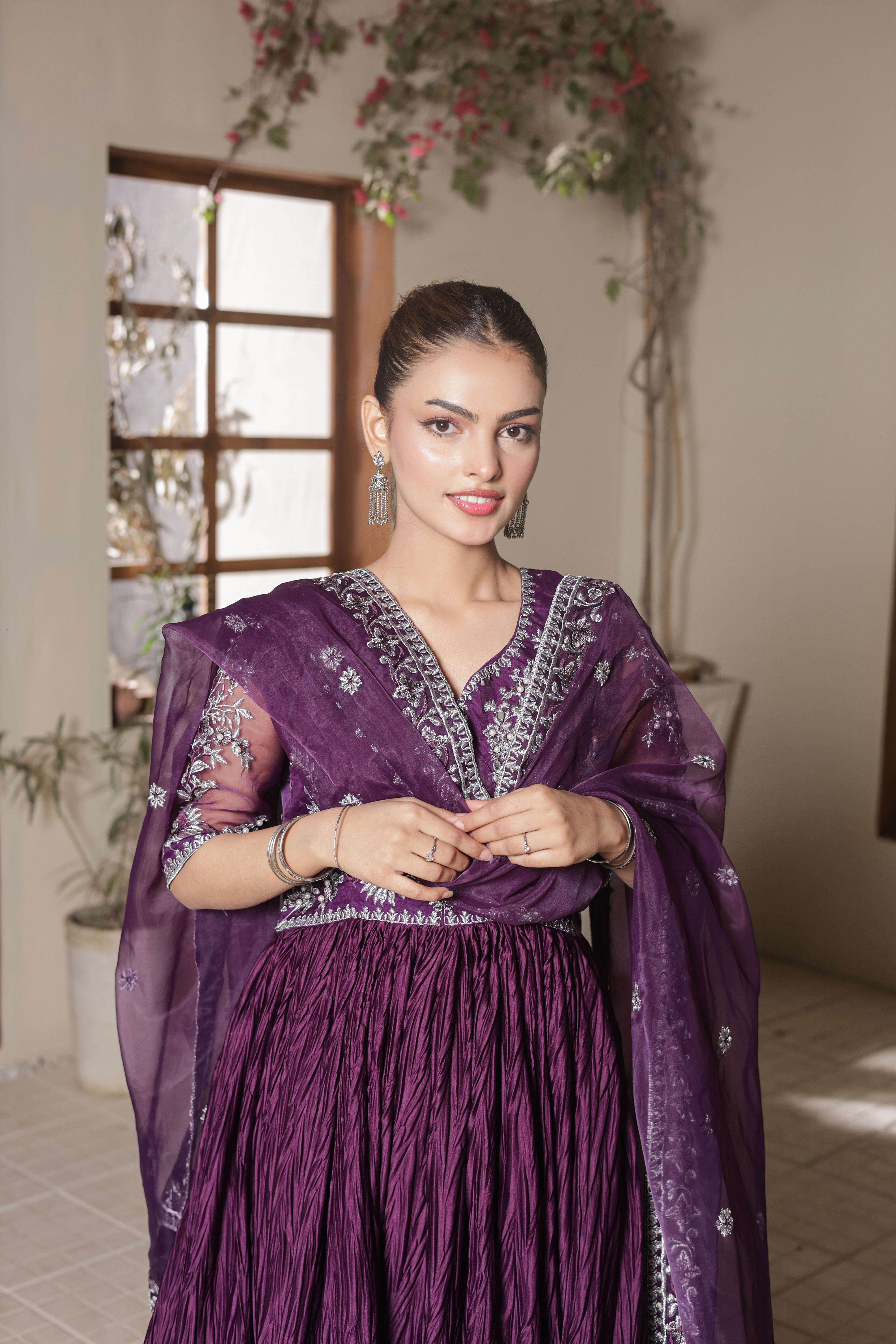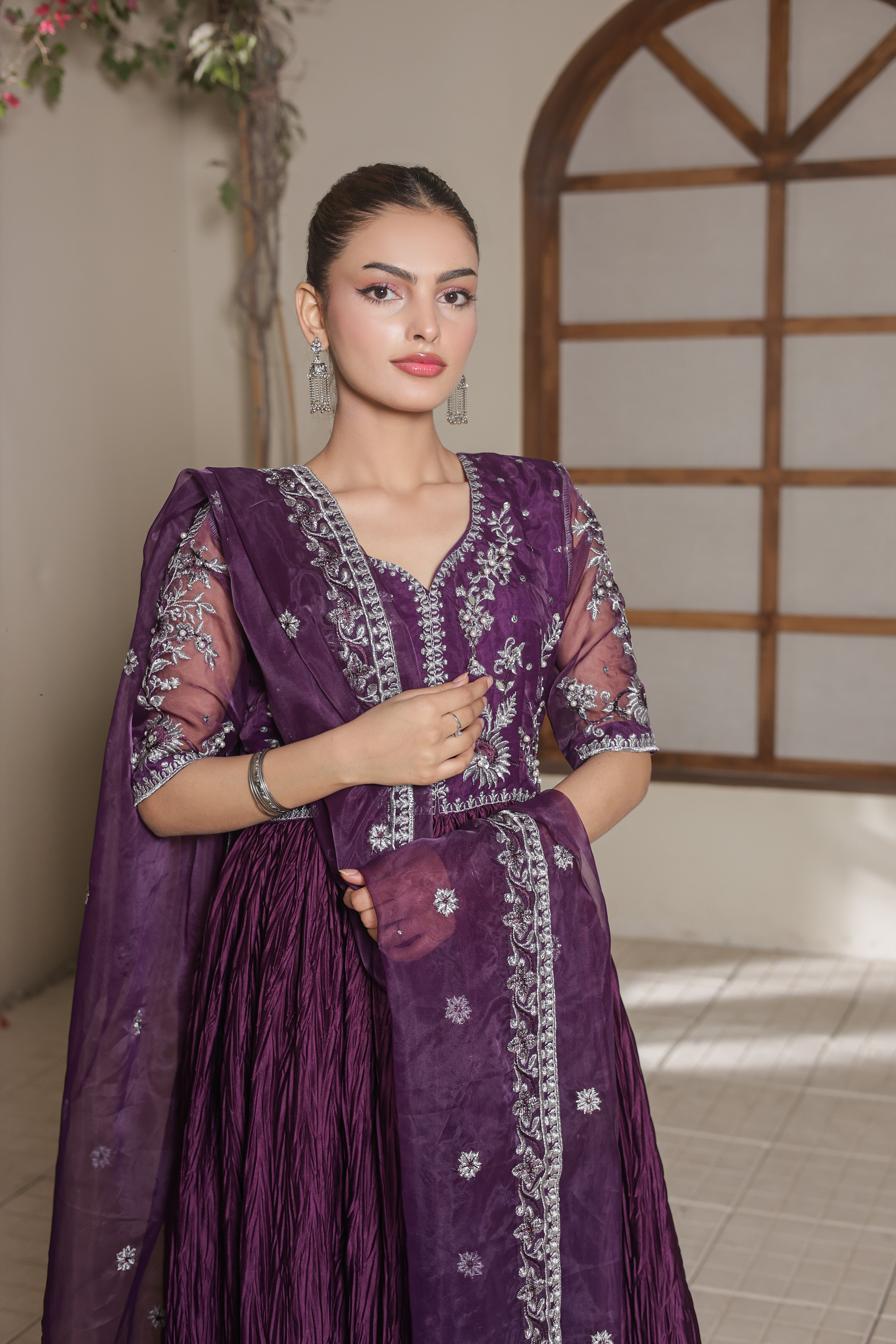 Evoking vintage glamour, Lina reimagines the classic pishwas in purple hue. Crafted from organza and silk crush, the pishwas is rendered with intricate embroidery with hand touching embellishment. Paired with a embroidered organza dupatta and silk churidar, this piece, with its perfect draping, is a true symphony of style.