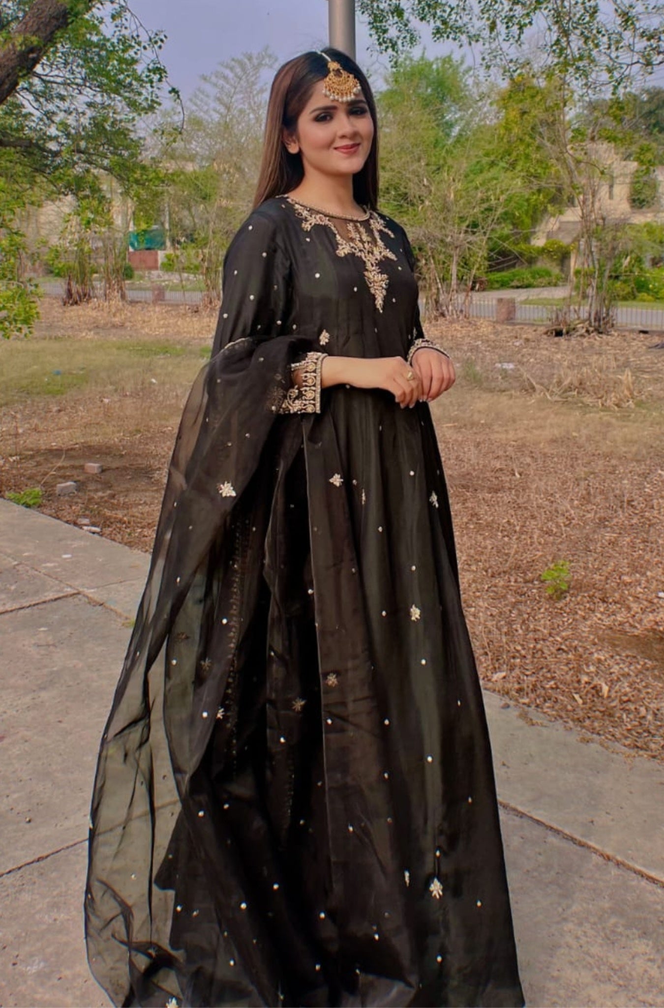 An enchanting three-piece cut from pure deep black cotton silk in a flowy long pishwas silhouette, with intricate gold zardosi hand craftsmanship on the back front neckline and sleeves with organza patchwork. The front and back have sequins & booti spray.