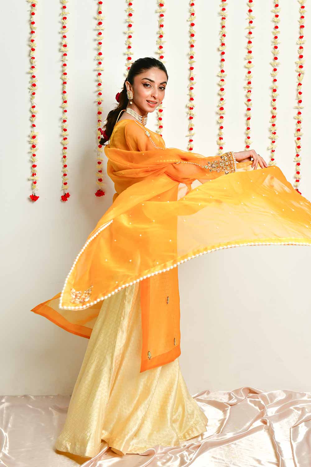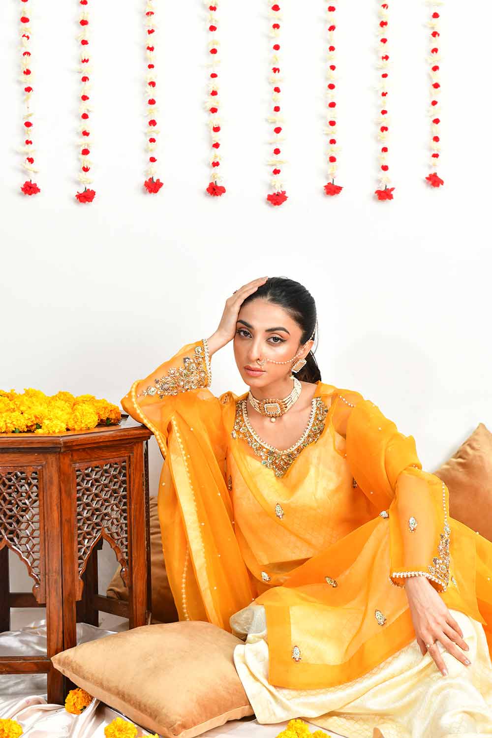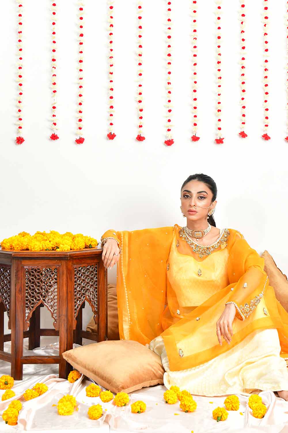 This stunning ensemble features a mustard straight organza shirt adorned with intricate handwork of naqshi, cutdana, sequins, dabka & pearls. Paired with a luxurious Jamawar lehenga Choli and an embellished dupatta with pearls will make you the center of attention.
