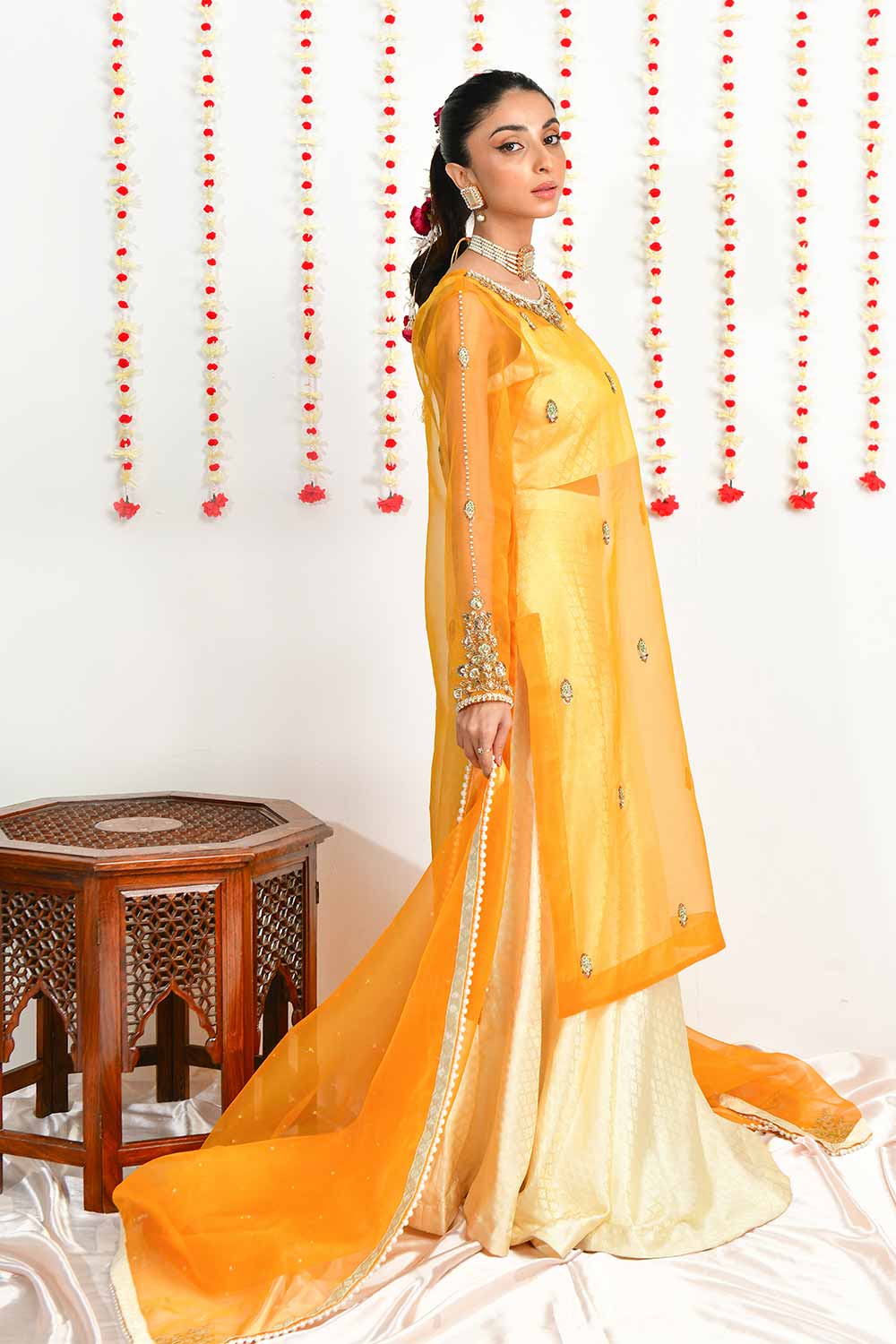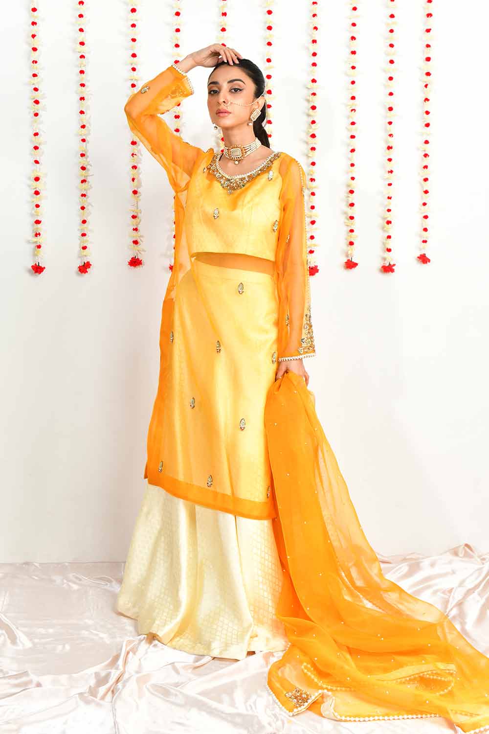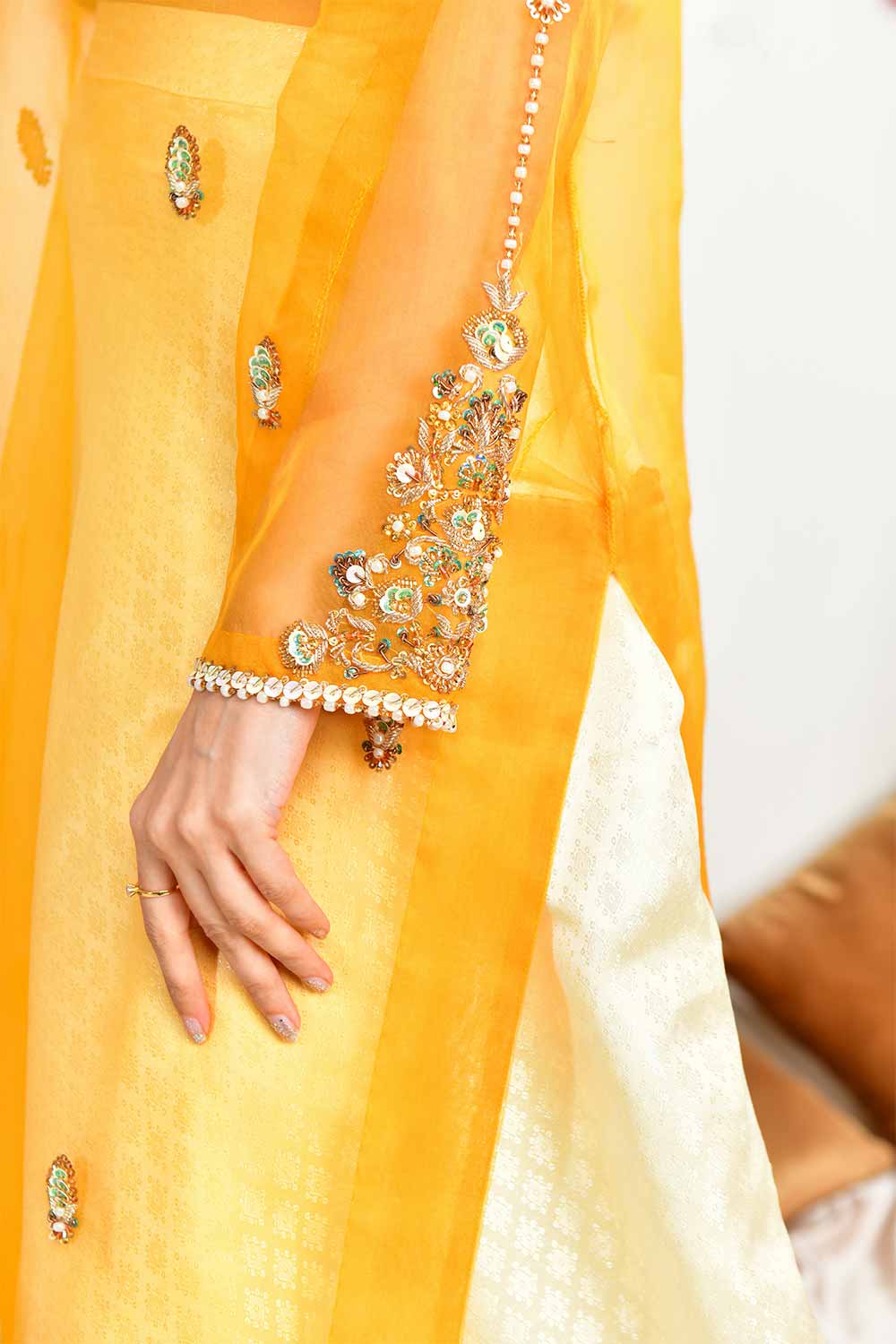 This stunning ensemble features a mustard straight organza shirt adorned with intricate handwork of naqshi, cutdana, sequins, dabka & pearls. Paired with a luxurious Jamawar lehenga Choli and an embellished dupatta with pearls will make you the center of attention.