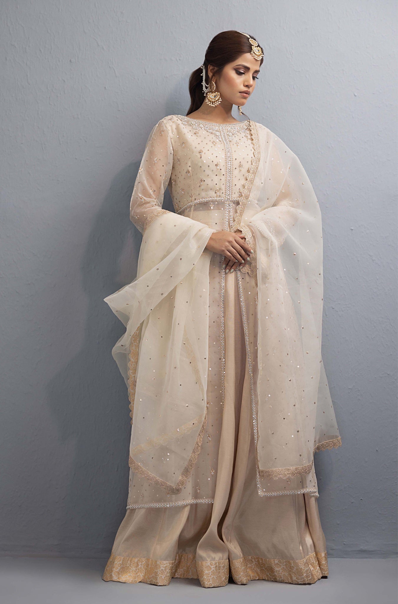 Naz- A graceful opulent beige organza delicately embellished front open pishwas, Perfect for a fairytale. Paired with a organza dupatta filled with sequins and lace work on all four sides. The pishwas is paired with a same color cotton silk sharara.