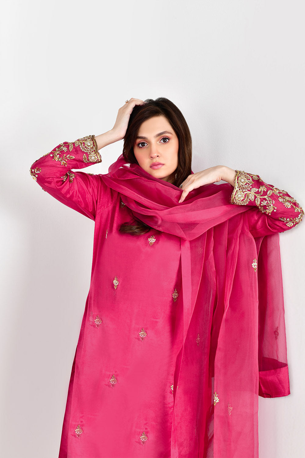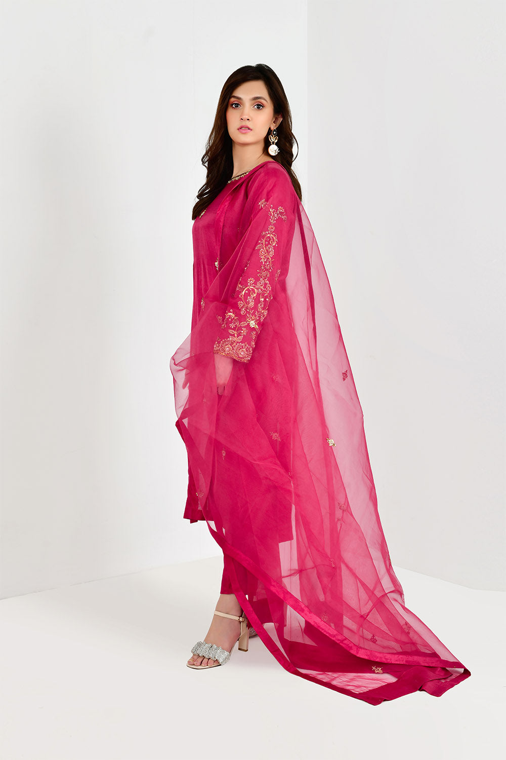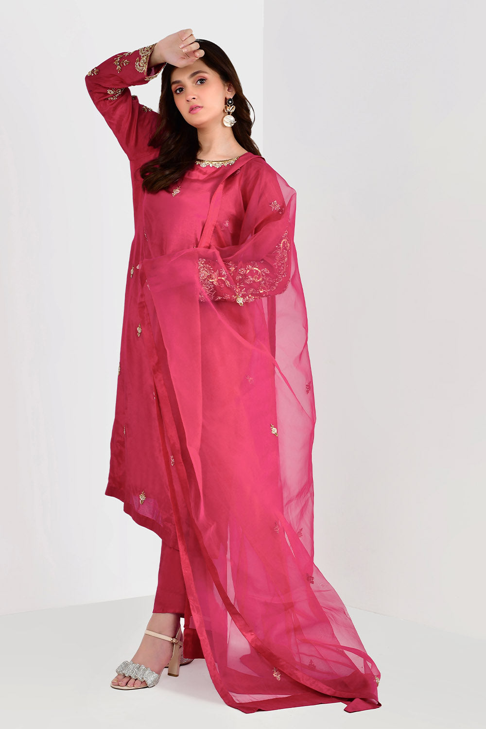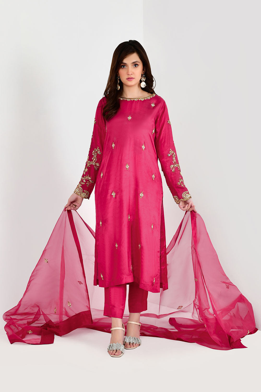 Adorned on cotton silk in an alluring hue of hot pink with heavy embellishment on sleeves and shirt with naqshi, cutdana, sequins and pearls. Paired with embellished dupatta and straight pants. Revamp your Festive look in this beautiful three piece.