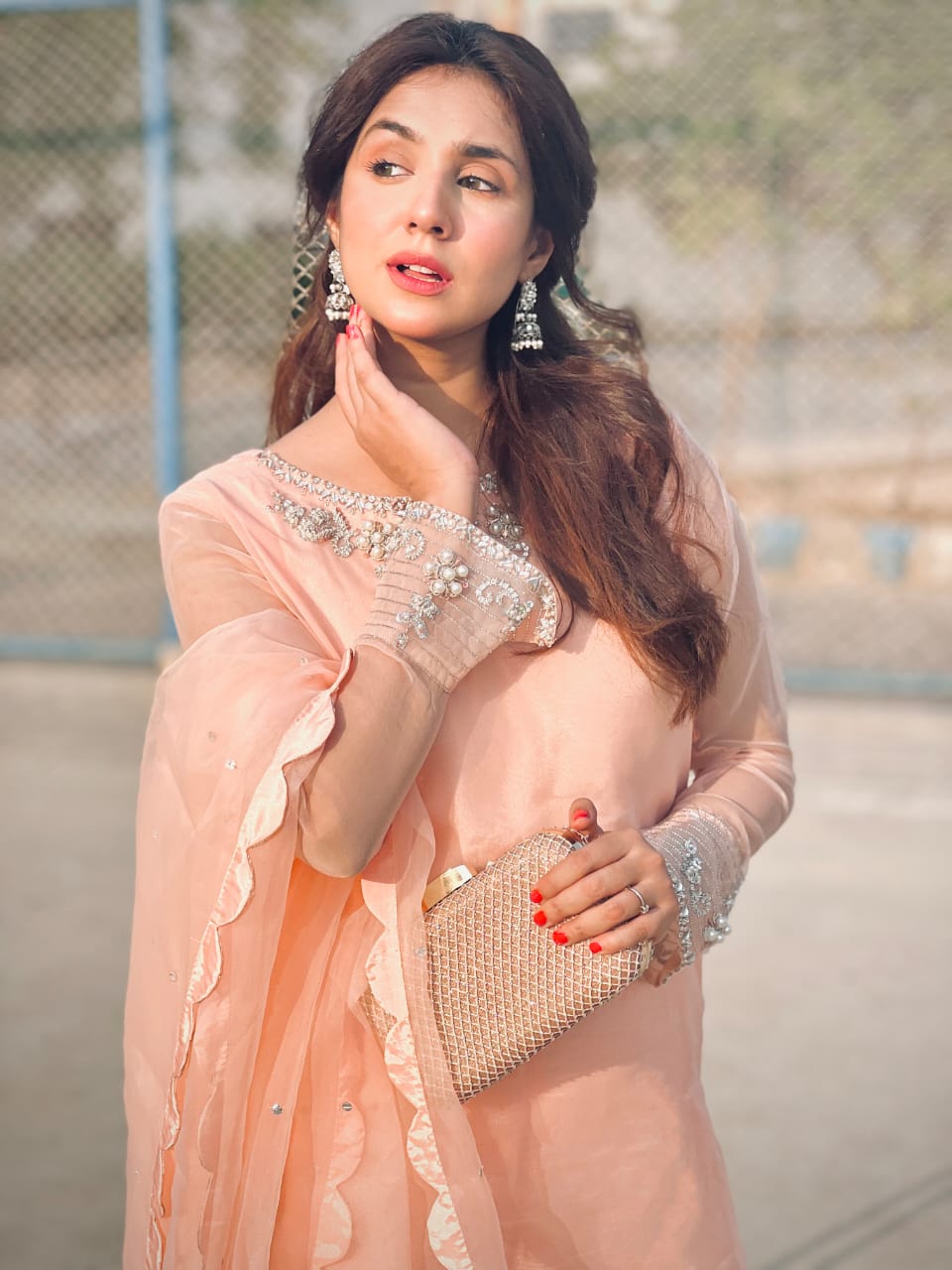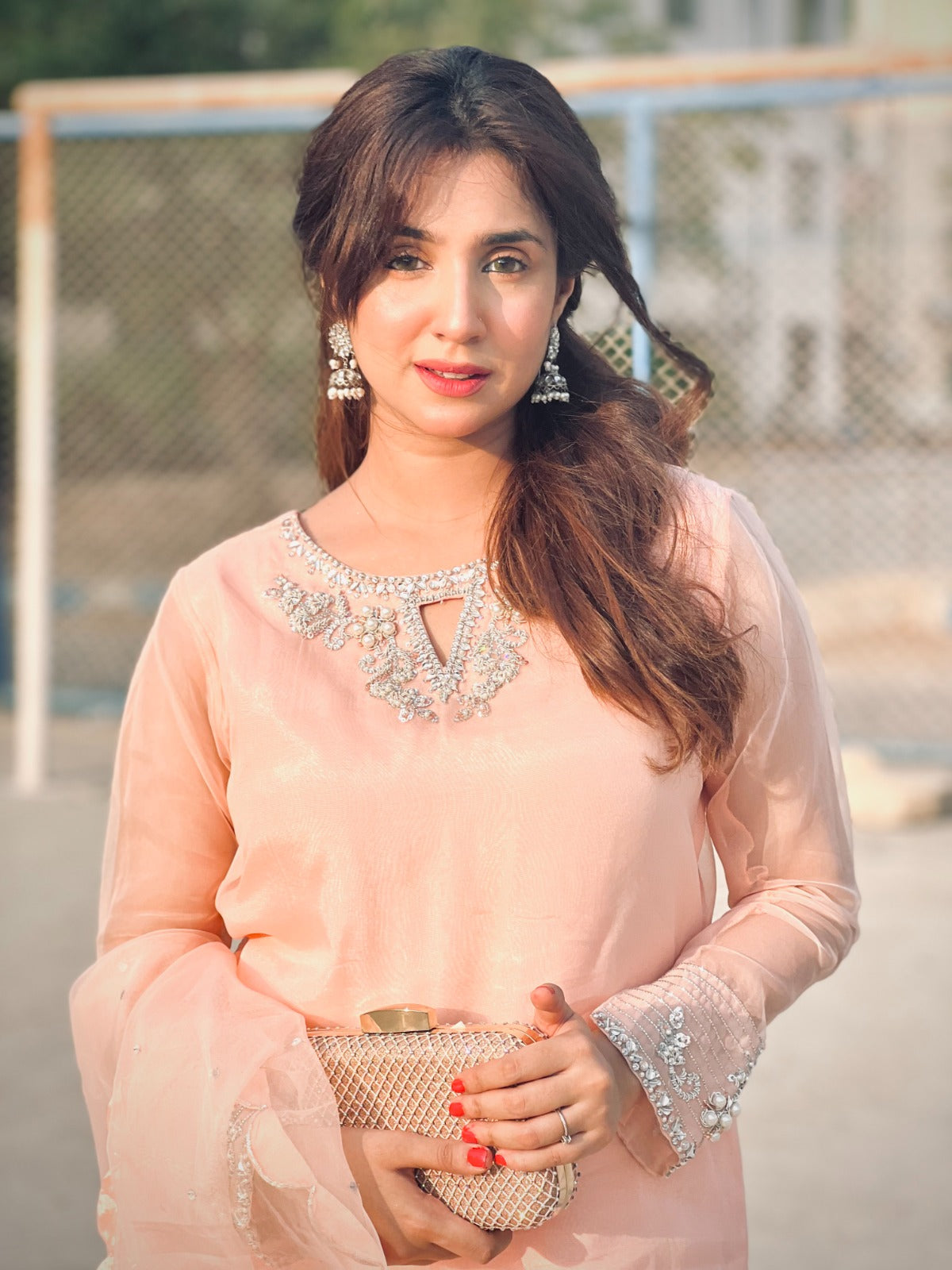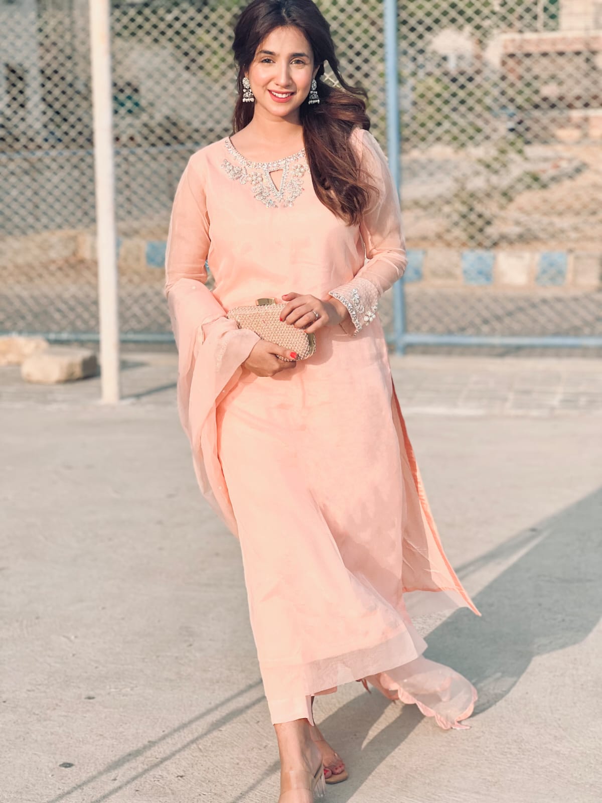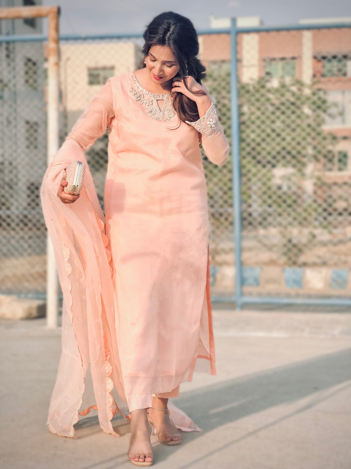 A pure powder peach premium organza long shirt with intricate hand embellishments on neckline and sleeves. Detailing of Kora, dabka, sequins, pearls and rhinestones. Paired with raw silk straight pants. Dupatta is a medium organza with cutwork on all four sides of dupatta to enhance the beauty.